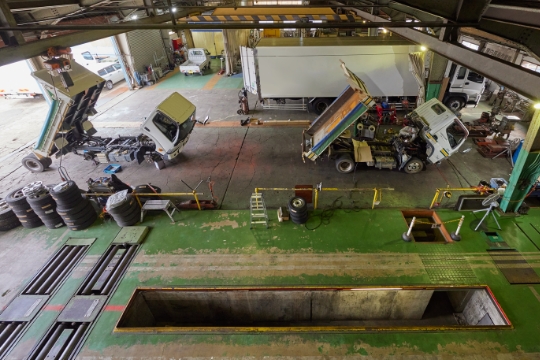 大形工場では、車検・点検・一般整備だけでなく、クレーン車を中心とする建設機械整備をはじめ、トラックボデーの修理・架装や鈑金塗装も手掛けます。クレーン及びボデーメーカーのサービス指定工場としても機能し、お客様のお仕事を支えます。
